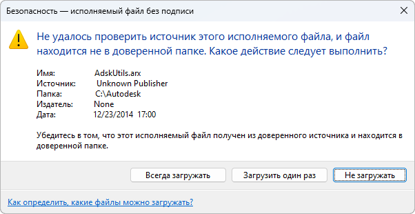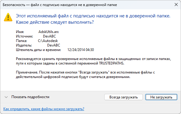 Решение. Загрузите и используйте файл. (Необязательно) Можно указать издателя в качестве доверенного, чтобы при последующей загрузке файлов с подписью этого издателя сообщение с предупреждением не отображалось.