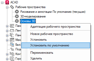 Рабочие пространства в файле CUIx могут быть помечены как используемые по умолчанию. Рабочее пространство, заданное как текущее, восстанавливается при первой загрузке файла CUIx в программу или при загрузке файла CUIx с помощью команды НПИЗАГР.