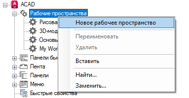 На вкладке "Адаптация" панели "Адаптации: <имя файла>" щелкните правой кнопкой мыши узел "Рабочие пространства" и выберите "Новое рабочее пространство".