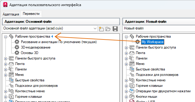 Перетащите рабочее пространство из файла CUIx на панели "Адаптации: <имя файла>" (справа) в узел "Рабочие пространства" основного файла CUIx на панели "Адаптации: <имя файла>" (слева).