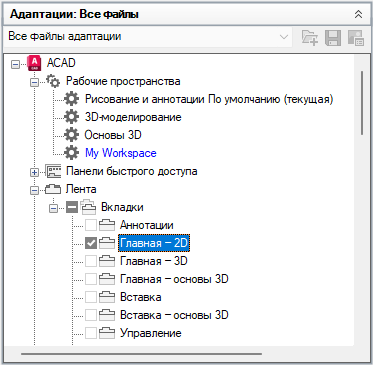 Прим.: Теперь рядом с узлами панели быстрого доступа, панелей ленты, панелей инструментов, раскрывающихся меню и файлов частичной адаптации отображаются поля для флажков, что позволяет без труда добавить элементы в рабочее пространство.