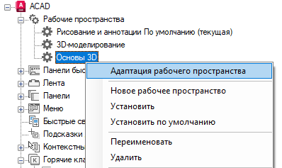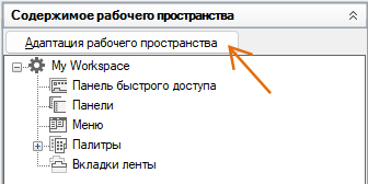 На вкладке "Адаптация" разверните на панели "Адаптации <имя файла>" узел "Рабочие пространства", щелкнув на знаке "плюс" (+) рядом с этим узлом.