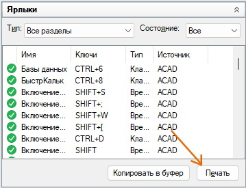 - На панели "Ярлыки" выполните фильтрацию типа и статуса горячих клавиш для печати.