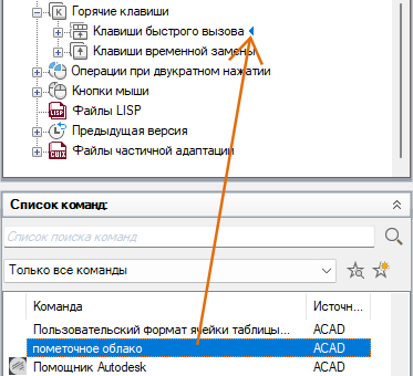 - Чтобы создать клавишу быстрого вызова, перетащите команду с панели "Список команд" в узел "Клавиши быстрого вызова" на панели "Адаптации: <имя файла>".