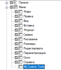 - На панели "Адаптации <имя файла>" разверните узел дерева "Панели инструментов", щелкнув знак "плюс" (+) рядом с этим узлом.