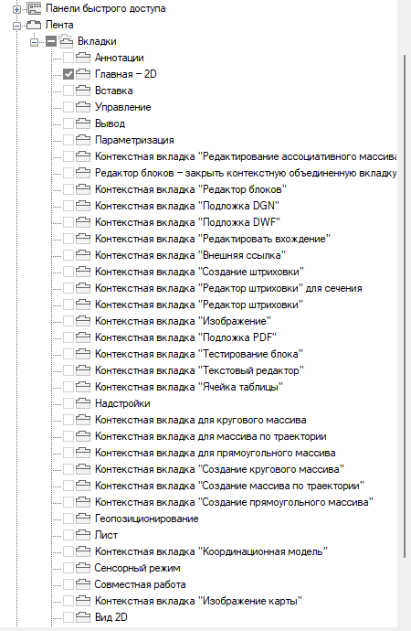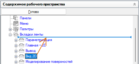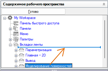 - На панели "Компоненты рабочего пространства" щелкните на значке "плюс" (+) рядом с узлом "Вкладки ленты", чтобы развернуть его.