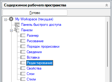 - На панели "Компоненты рабочего пространства" разверните узел "Панели инструментов", щелкнув знак "плюс" (+) рядом с ним.