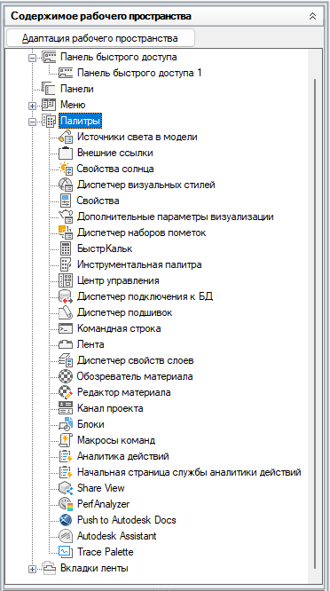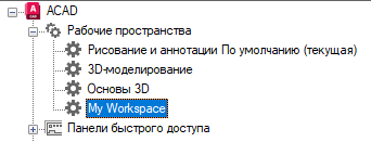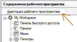 - На вкладке "Адаптация" разверните на панели "Адаптации <имя файла>" узел "Рабочие пространства", щелкнув на знаке "плюс" (+) рядом с этим узлом.