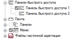 - На панели "Адаптации <имя файла>" разверните узел "Панели "Быстрый доступ", щелкнув знак "плюс" (+) рядом с этим узлом.