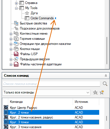 Перетащите команду, которую требуется добавить, с панели "Список команд" на вложенное меню, расположенное на панели "Адаптации: