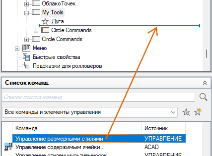 4. Перетащите команду, которую требуется добавить, с панели "Список команд" на нужную панель инструментов, которая находится на панели "Адаптации <имя файла>".