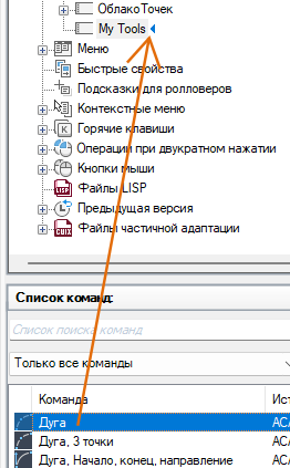 На панели "Список команд" отображается только список элементов управления панели инструментов.