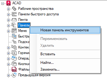 1. На вкладке "Адаптация" разверните на панели "Адаптации <имя файла>", щелкните правой кнопкой мыши узел "Панели инструментов" и выберите пункт "Новая панель инструментов".