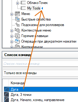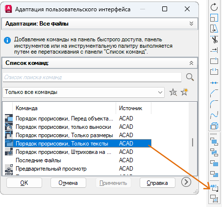 3. На вкладке "Адаптация" найдите на панели "Список команд" команду, которую требуется добавить, и перетащите ее в панель инструментов, отображаемую в окне приложения.