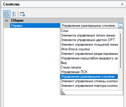 4. На панели "Свойства" в поле "Элемент управления" нажмите стрелку вниз для вывода списка всех доступных элементов управления панели инструментов.