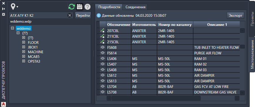 Перейдите на вкладку "Местоположение". Выберите в дереве узел или устройство для просмотра соответствующих подробностей или соединений. Выберите верхний узел для просмотра всего проекта. Нажмите .