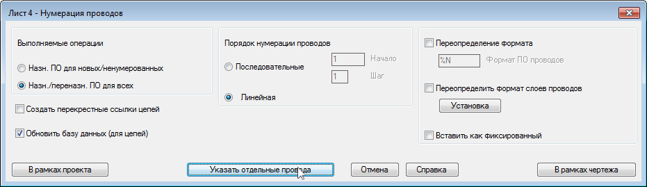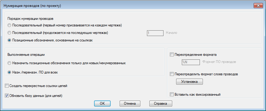 Можно обрабатывать и назначать позиционные обозначения для проводов с последовательными номерами или с номерами, основанными на местоположении начальной ссылки в сети проводов. При автоматической вставке номеров проводов на чертеж номера не повторяются.