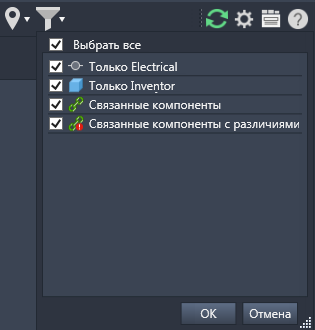 Компоненты можно отфильтровать на виде дерева компонентов в зависимости от статуса связи.