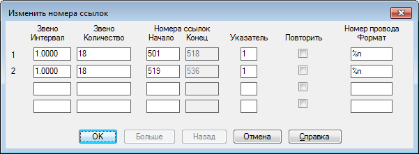 В диалоговом окне "Изменить номера линейных ссылок" отображается список многозвенных цепей на чертеже.
