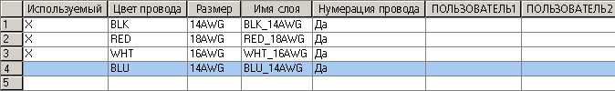 Щелкните в столбце "Цвет провода" в пустой строке и введите СИН.