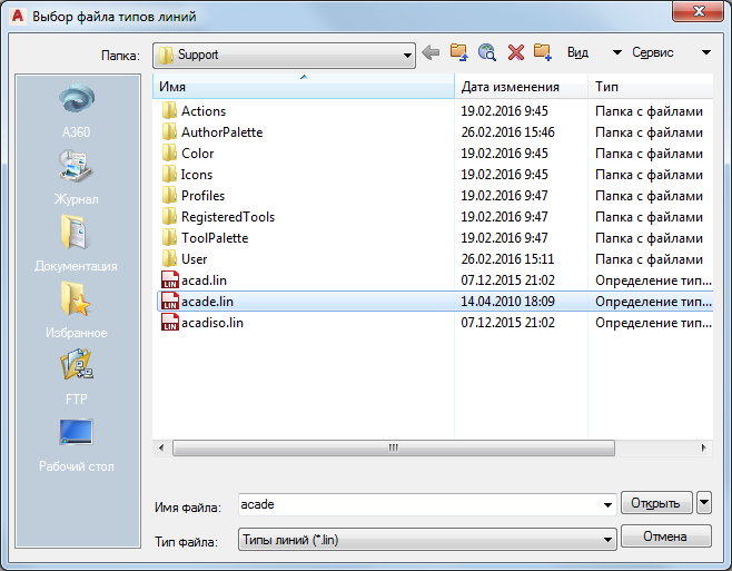В диалоговом окне "Выбор файла типов линий" выберите "acade.lin" и нажмите "Открыть".