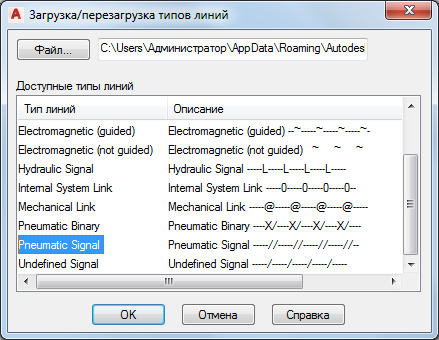 В диалоговом окне "Загрузка/перезагрузка типов линий" выберите "Pneumatic Signal" ("Пневматический сигнал") и нажмите кнопку "ОК".