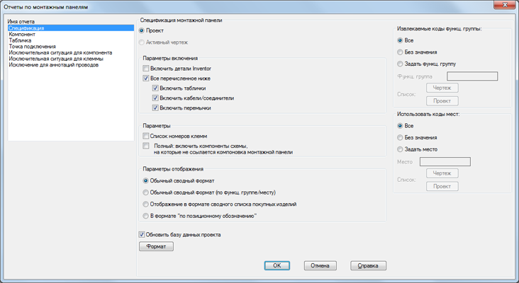 Определение того, нужно ли включить в отчет информацию о табличках, кабелях, соединителях и перемычках. Для включения или исключения необходимых параметров используйте соответствующие флажки.
