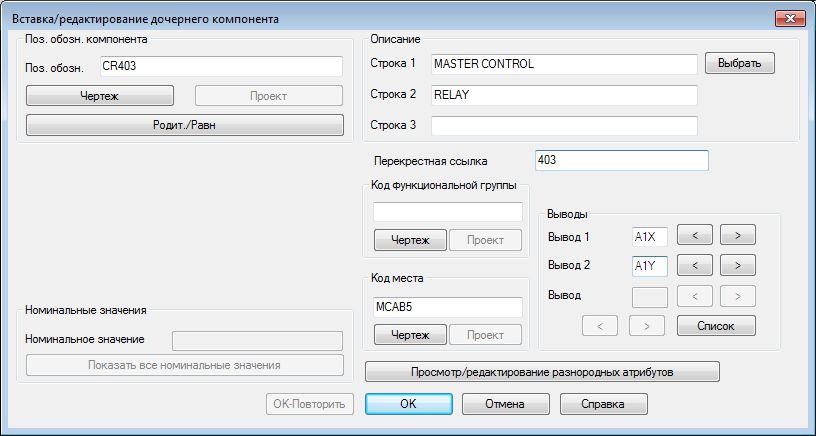 Дочерний компонент вставлен. К нему можно в реальном времени обратиться по перекрестной ссылке. Аннотация катушки содержит номер линейной ссылки на новый дочерний контакт. В аннотации дочернего компонента приводится место с номером линии родительского компонента-катушки.
