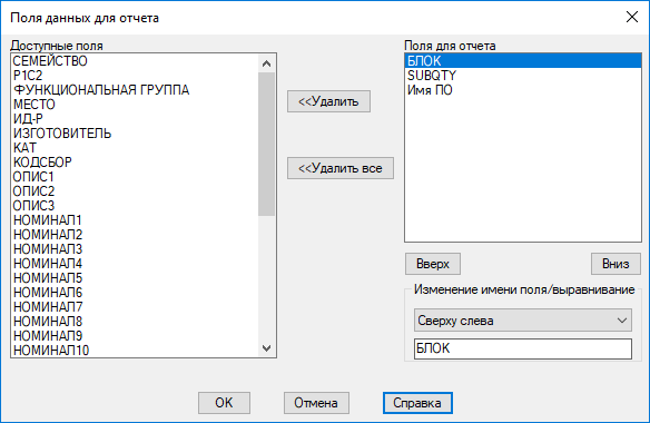 Выберите в списке отчета «Список графических образов». Нажмите кнопку «Изменить поля отчета» в диалоговом окне «Отчеты по схемам».