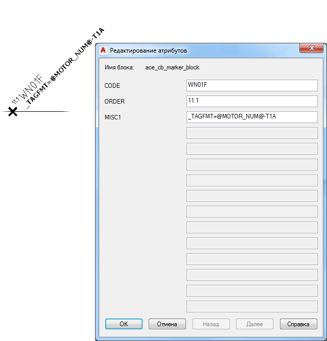 Второй вызов, "c:ace_cb_save", сохраняет значение атрибута ПОБОЗНАЧЕНИЕ1 на двигателе в память под позиционным обозначением-указателем “@MOTOR_NUM@”. Это значение может использоваться при обработке блоков обозначений последующих номеров проводов.