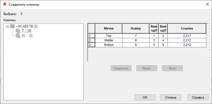 В диалоговом окне "Соединить клеммы" выберите клемму "10, , (3)" и нажмите кнопку "Соединить".
