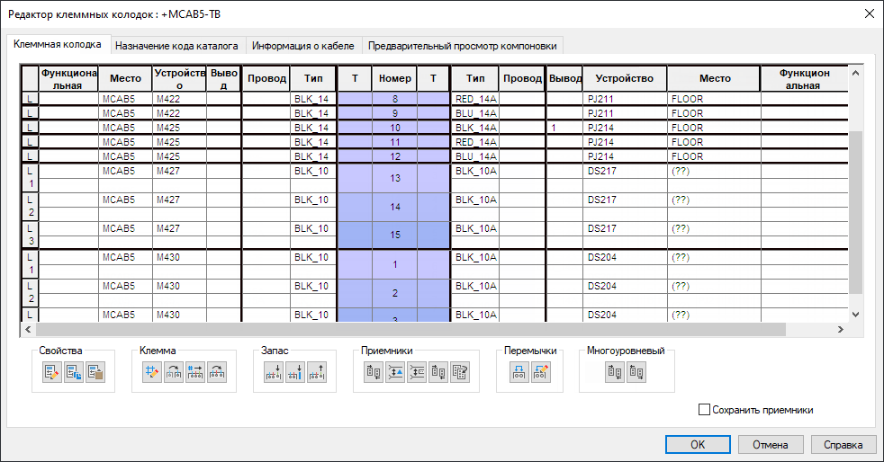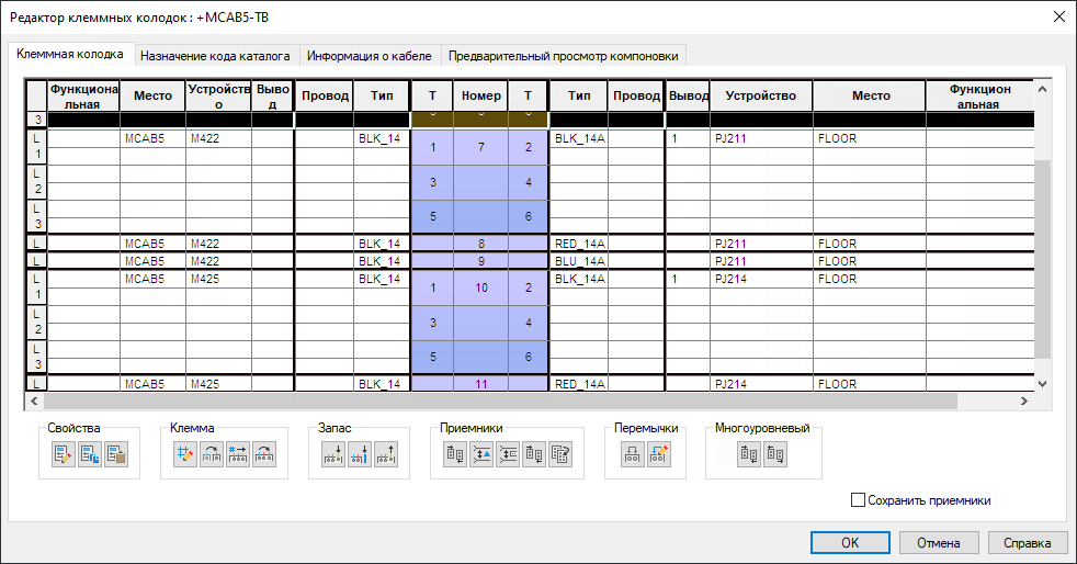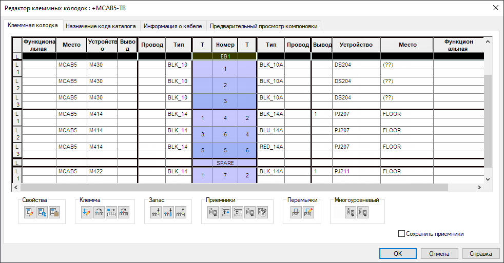 Для управления клеммами, редактирования свойств клемм, соединения клемм и вставки графической клеммной колодки служит редактор клеммных колодок.