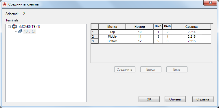 Прим.: Для перемещения клеммы 1 в верхнюю строку таблицы также можно использовать инструмент "Вверх".