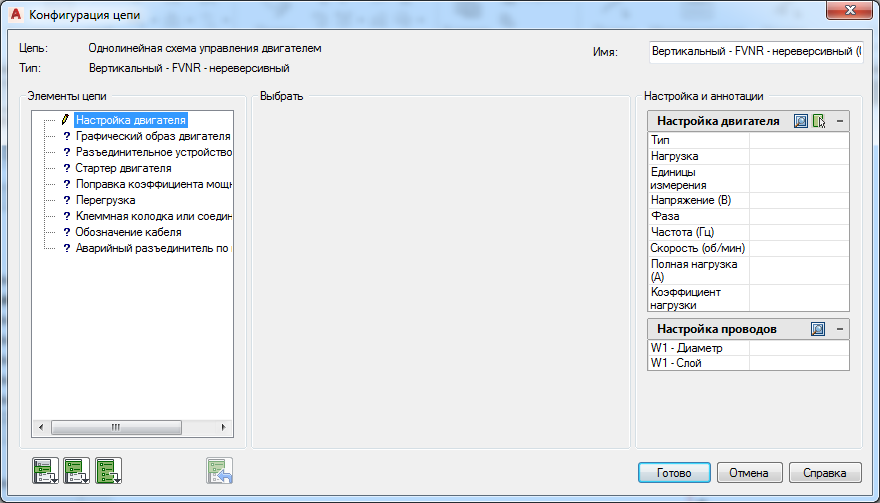 Использование конструктора цепей для вставки однолинейной цепи управления двигателем и размера провода на основе отраслевых стандартов.