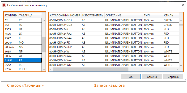 - Отображение списка таблиц и количества записей в таблице, содержащих значение по каталогу. Выберите таблицу для отображения записей этой таблицы, соответствующих искомому значению.