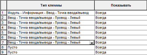 По умолчанию, во время создания модуля ПЛК редактор файлов базы данных ПЛК заносит в столбец "Тип клеммы" столько пустых полей, сколько клемм определено в диалоговом окне "Новый модуль".
