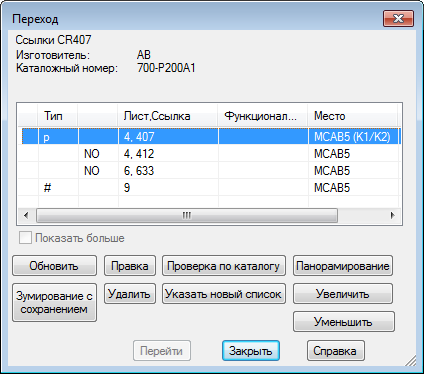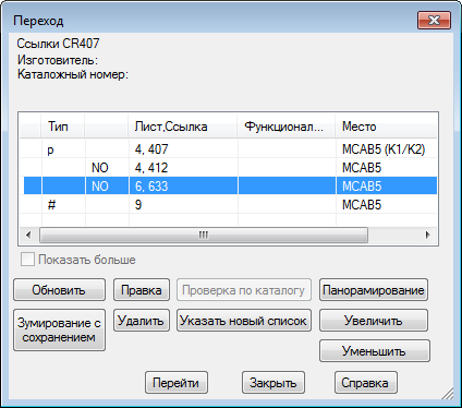 В диалоговом окне "Переход" отображаются все экземпляры компонента CR407.