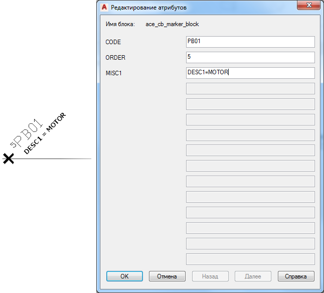 В AutoCAD Electrical toolset найдите блок обозначений, который определяет точку вставки для графического обозначения двигателя. Найдите значение атрибута CODE, например, MTR03.