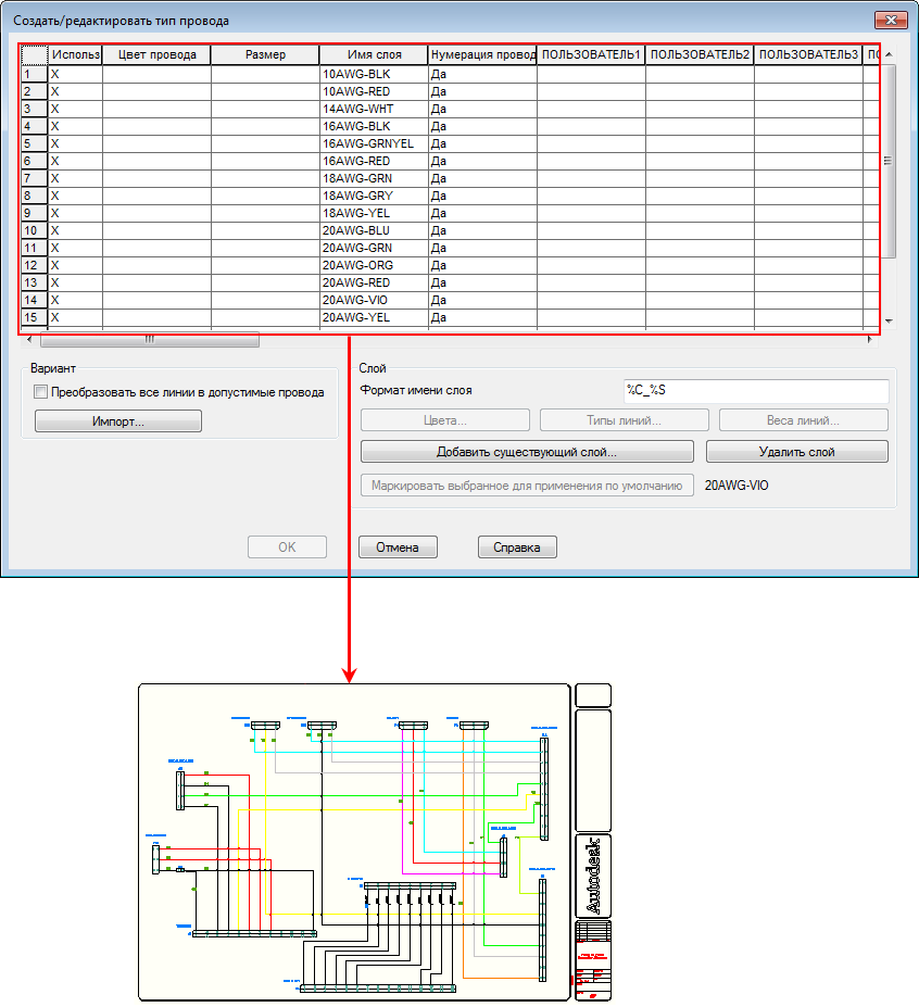 Для создания новых или редактирования существующих типов проводов воспользуйтесь инструментом "Создать/редактировать тип провода", а для преобразования линий в провода — инструментом "Изменить/преобразовать тип провода". Имя слоя провода и связанные с ним свойства проводов (такие как цвет и размер провода, а также признак, который показывает, обрабатываются ли номера проводов в данном слое) сохраняются в файле чертежа. Слой проводов для нового провода определяется следующими правилами.