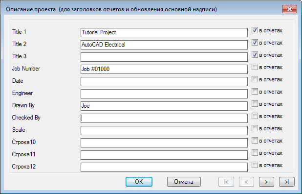 В диалоговых окнах AutoCAD Electrical toolset, связанных с основной надписью и описанием проекта, отображаются типовые метки следующего вида: LINE1, LINE2 и т. п. Эти метки можно изменить таким образом, чтобы они соответствовали связи с основной надписью. Пусть, например, значение LINE4 данныхAutoCAD Electrical toolset связано с атрибутом основной надписи JOB#, выводящим номер задания. При отображении в AutoCAD Electrical toolset диалогового окна, связанного с основной надписью, требуется, чтобы вместо LINE4 отображалось «Номер задания». Пользовательские метки определяются в текстовом файле с расширением WDL.