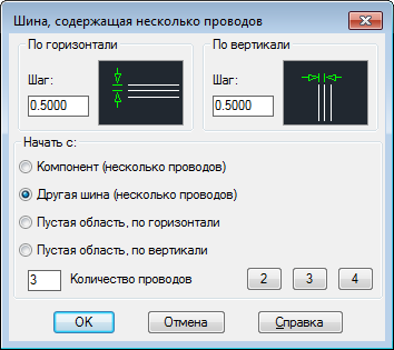 Можно вставить вертикальную или горизонтальную 3-фазную проводку. При обнаружении на траектории трехфазной проводки каких-либо компонентов, ее провода разрываются с последующим восстановлением соединений с компонентами. При пересечении какой-либо существующей проводки вставляются петли пересечения проводов.
