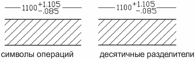 Помимо расположения значений допусков по вертикали, можно управлять выравниванием по горизонтали верхнего и нижнего значений допуска. Верхнее и нижнее значения допуска можно выровнять, используя либо операционные символы, либо десятичные разделители.