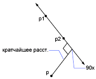 Определение кратчайшего расстояния от точки p до линии, проходящей через точки p1 и p2.