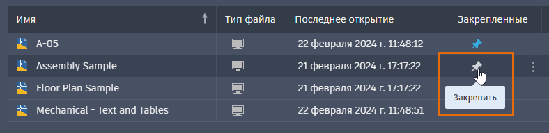 Прим.: Закрепленные документы всегда отображаются в верхней части списка.