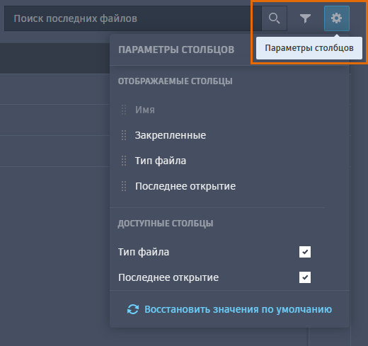 При просмотре в виде списка значок параметров столбцов (зубчатое колесо) в верхнем правом углу можно использовать для настройки вида путем переключения отображаемых столбцов и порядка их отображения. Столбцы «Имя» и «Закреплено» всегда отображаются как первый и последний столбцы соответственно.