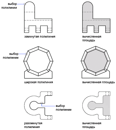 Если замкнутые площади преобразуются в области, их можно добавить или вычесть, чтобы создать составную площадь, а затем с помощью палитры свойств или команды СПИСОК найти требуемую информацию.