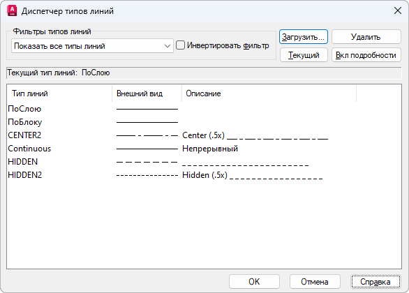 Удаляет выбранные типы линий из чертежа. Можно удалить только неиспользуемые типы линий. Типы линий ПОСЛОЮ, ПОБЛОКУ и CONTINUOUS нельзя удалить.