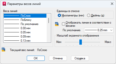 Задание текущего значения и единиц измерения веса линий, управление отображением и масштабом отображения веса линий, а также выбор значения веса линий ПО УМОЛЧАНИЮ для слоев.