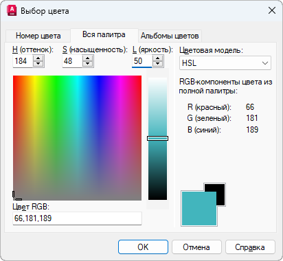 Задание цвета из полной палитры цветов (True Color, 24-битные цвета). Цвет выбирается с помощью цветовой модели HSL (оттенок, насыщенность, яркость) или RGB (красный, зеленый, синий). Полная палитра содержит более 16 миллионов цветов. В зависимости от выбранной цветовой модели на вкладке "Вся палитра" доступны различные параметры.