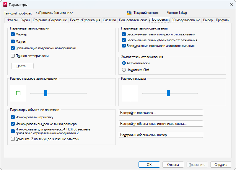 Вкладка "Построения" (диалоговое окно "Параметры")